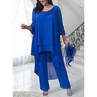 Jumpsuit / Pantsuit Mother of the Bride Dress Formal Wedding Guest blue Elegant Vintage Straight Neckline V Neck Floor Length Chiffon 3/4 Length Sleeve with Ruched Cascading Ruffles 2024 Lightinthebox
